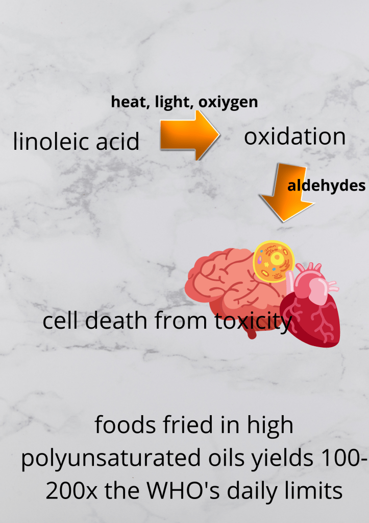Well it turns out that the process of extracting these oils via heating and just the oils sitting on the shelf in the light causes oxidation to occur. This changes the structure of the oil or fat. All of these poly-unsaturated fats/oils undergo this process. So why is oxidation bad? Basically oxidation causes death to cells. You can see it when certain foods are left sitting out and the color changes and the smell of them is undesirable, such as meat, fresh fruits and vegetables. The same can be said as when metal rusts. Well it turns out that the more easily our cells are to oxidize, the easier it is for us to quickly age or even die. A diet high in these poly-unsaturated oils or fats make our cells easier to break down or die. A diet high in fats or oils harder to breakdown such as the saturated oils like butter, olive oil and coconut oil help with longevity as they are much less susceptible to oxidation.