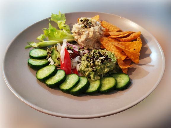 (boil a few eggs ahead of time, mix in chopped green veggies: cucumbers, onions, bell peppers, garlic, add humus instead of mayo, about a teaspoon of olive or avacado oil).