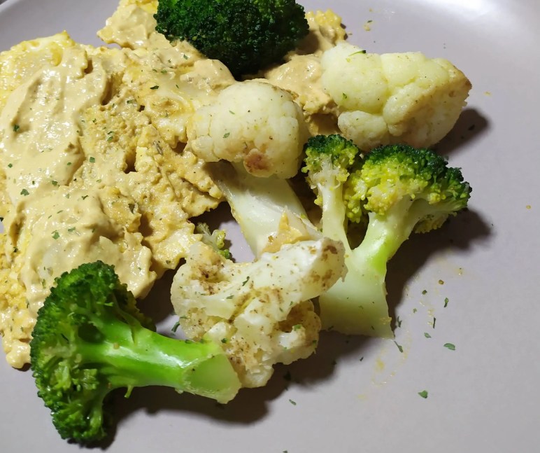 A light side of mushroom stuffed ravioli pasta with a veggie cashew cheese sauce (recipe posted below) plus steamed broccoli and cauliflower: